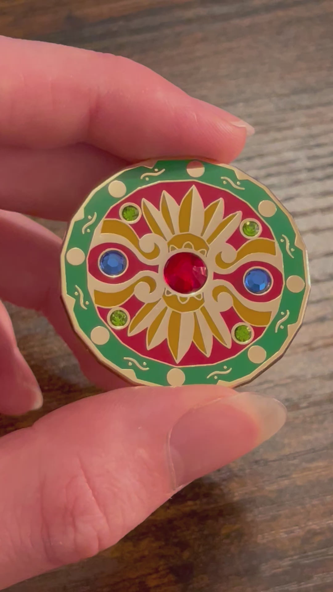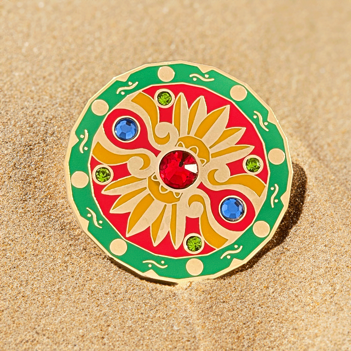 Le Bouclier du Soleil, le plus rare et le plus prestigieux des boucliers Gerudo, a autrefois été manié par Urbosa, la prodige foudroyante. Orné de sept strass scintillants, il incarne la force et la noblesse de cette légendaire guerrière du désert.