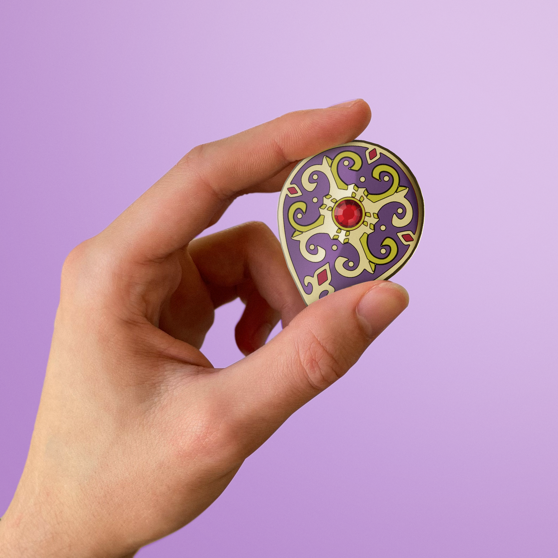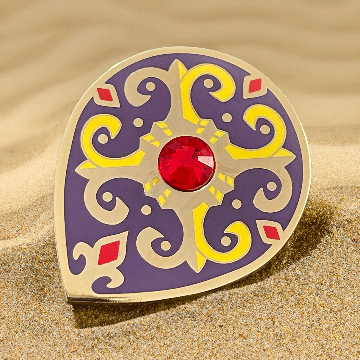 Inspiré du Bouclier Radieux, cette version plus robuste du bouclier Gerudo est ornée d’un strass scintillant et symbolise le soleil éclatant du désert. Son design raffiné en fait un accessoire incontournable pour tout aventurier en quête d’élégance et de protection.